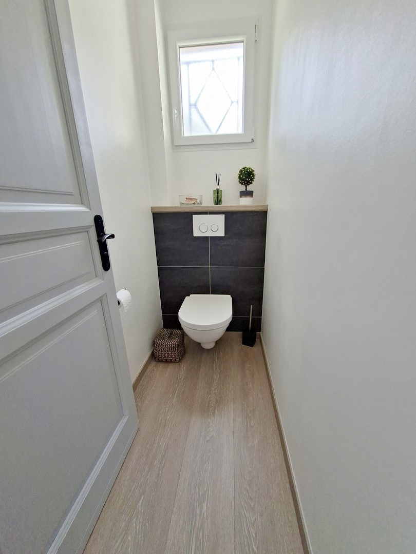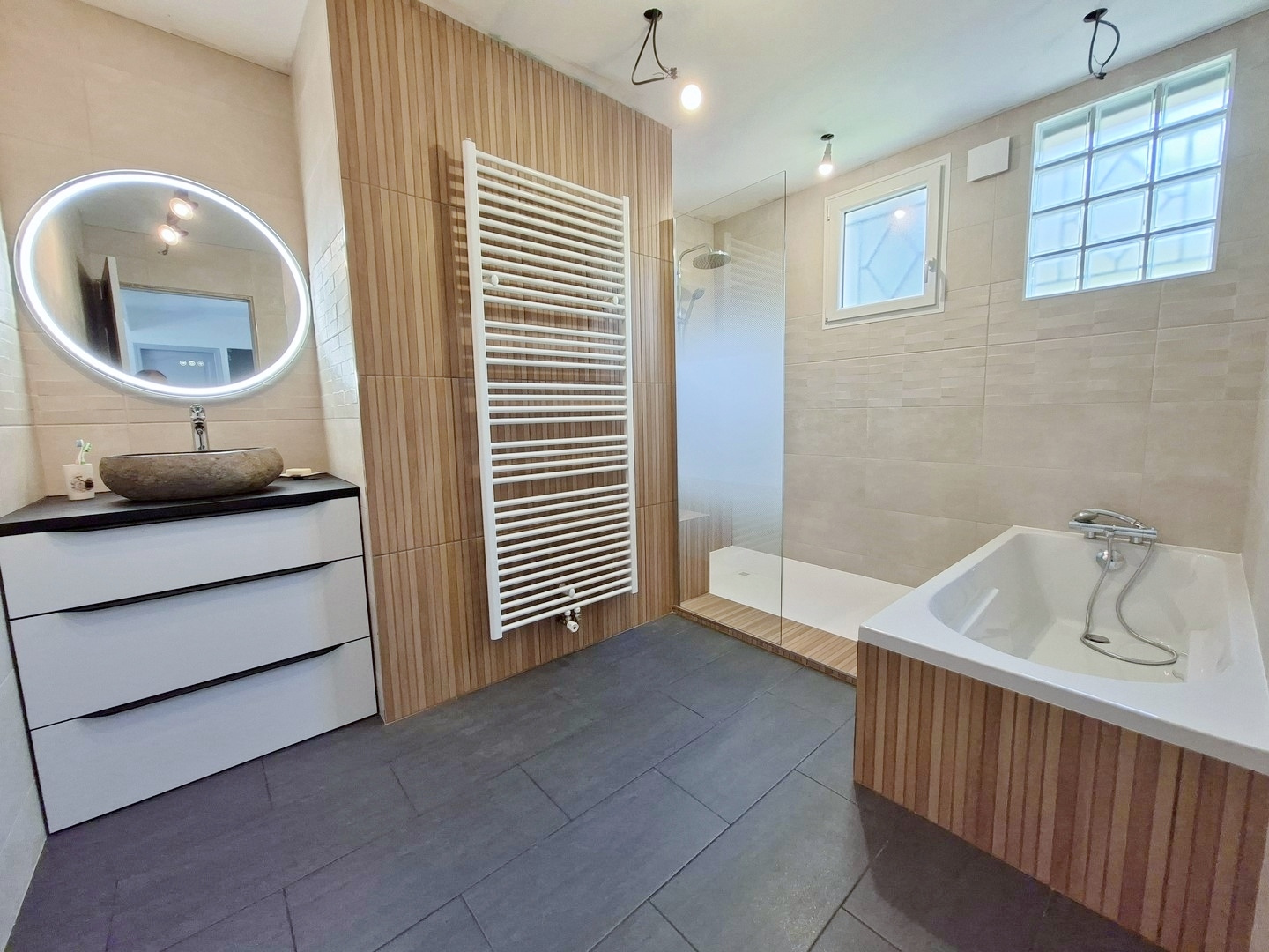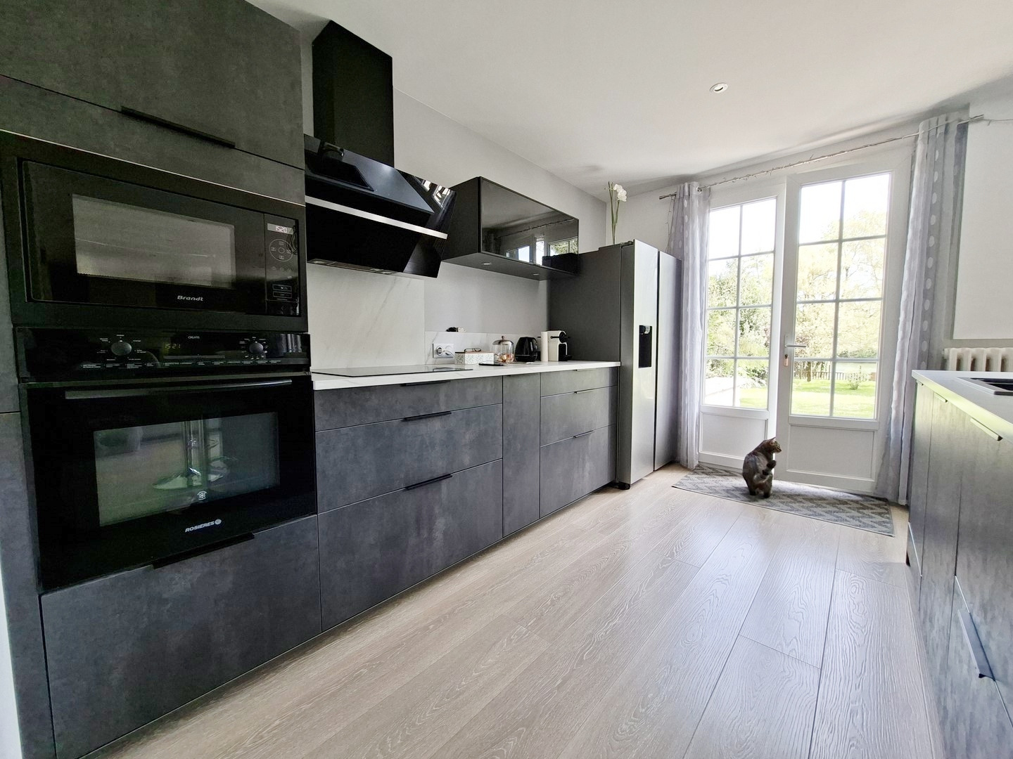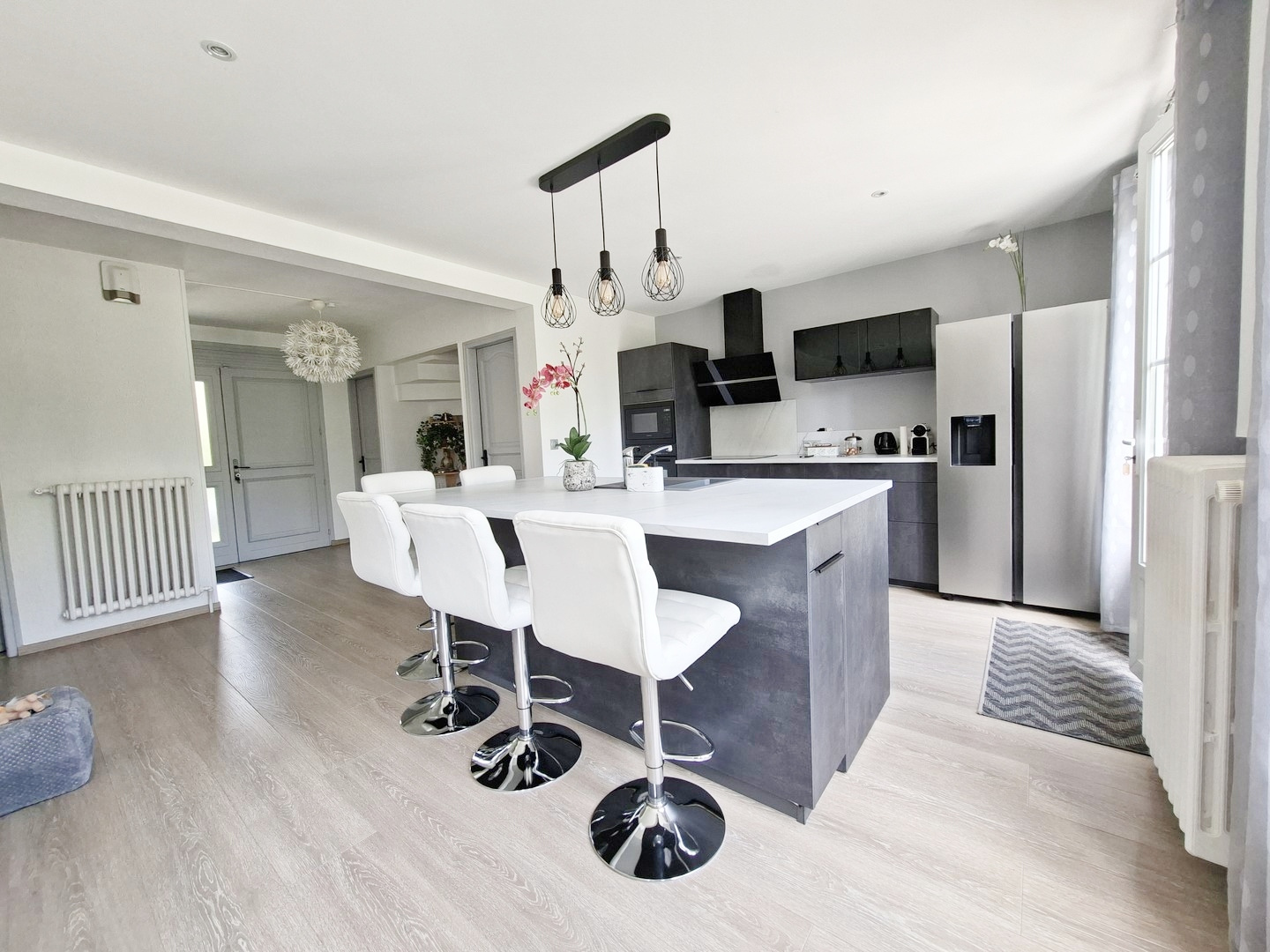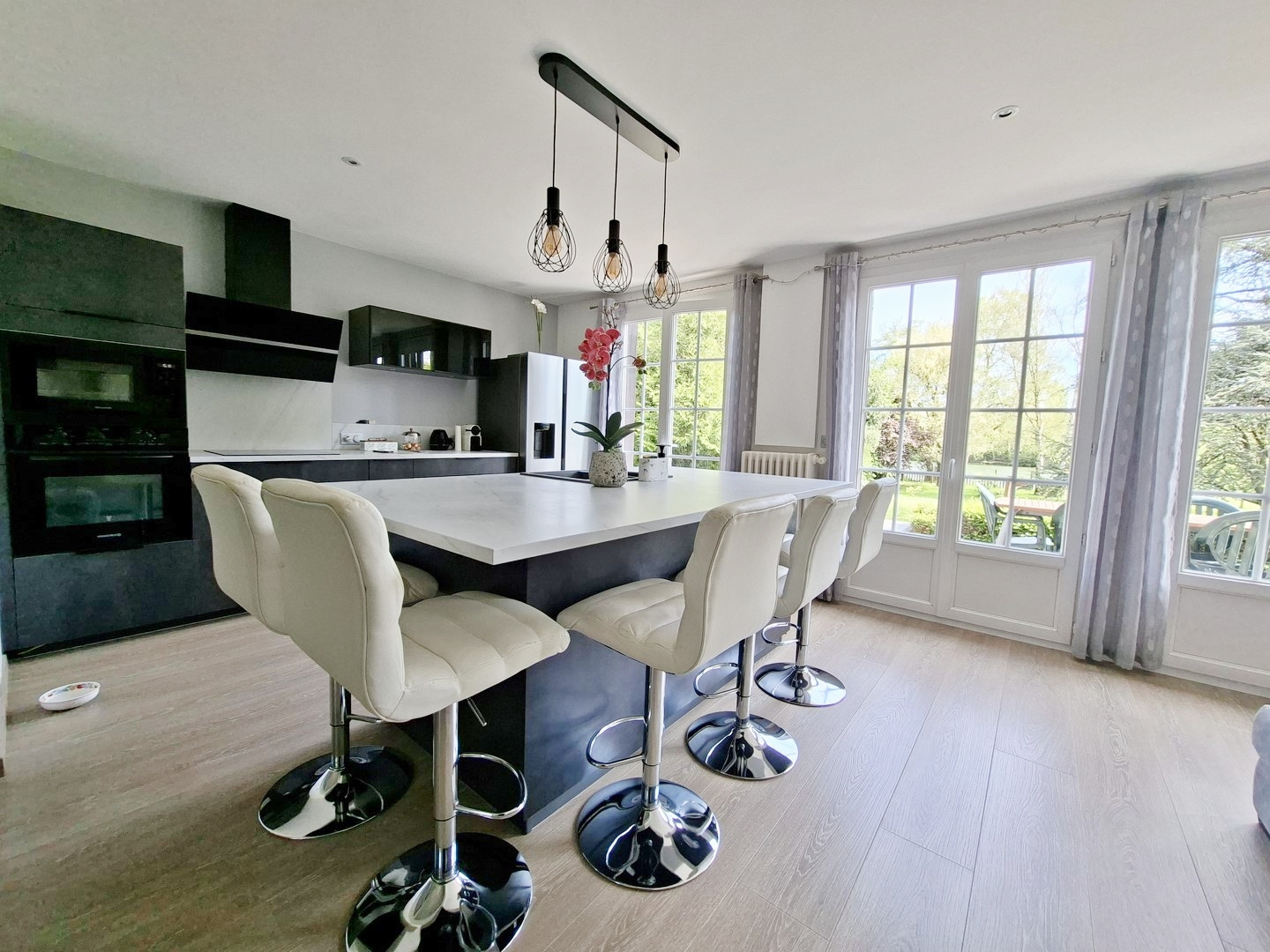 Pontoise l'Hermitage - Maison individuelle en parfait état, de 6 pièces principales, 202 m² utiles et 155 m² habitables, édifiée sur 2284 m² de terrain paysager, comprenant en rdc : entrée placards, cuisine de 11 m², aménagée et équipée ouverte sur séjour double 42 m² donnant sur terrasse de 30 m², chambre 10,77 m², wc, salle d'eau, buanderie ; à l'étage : mezzanine 15 m², dégagement 13 m², dressing, 3 chambres 17 - 11,80 - 11 m², dont 2 avec placards, salle de bains. Double vitrage, pompe à chaleur. Garage 35 m², stationnement sur terrain 3 vt. Ponton privatif. Honoraires charge vendeur